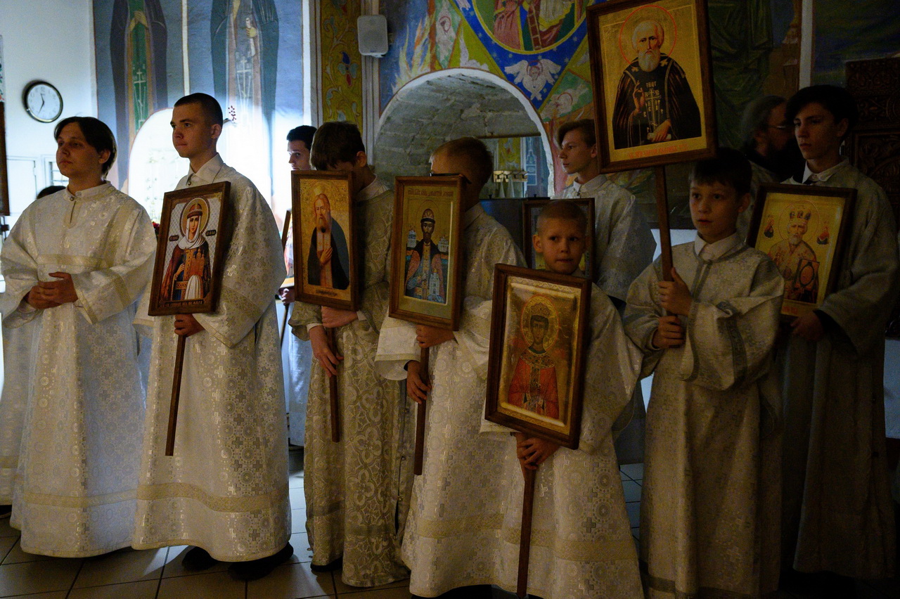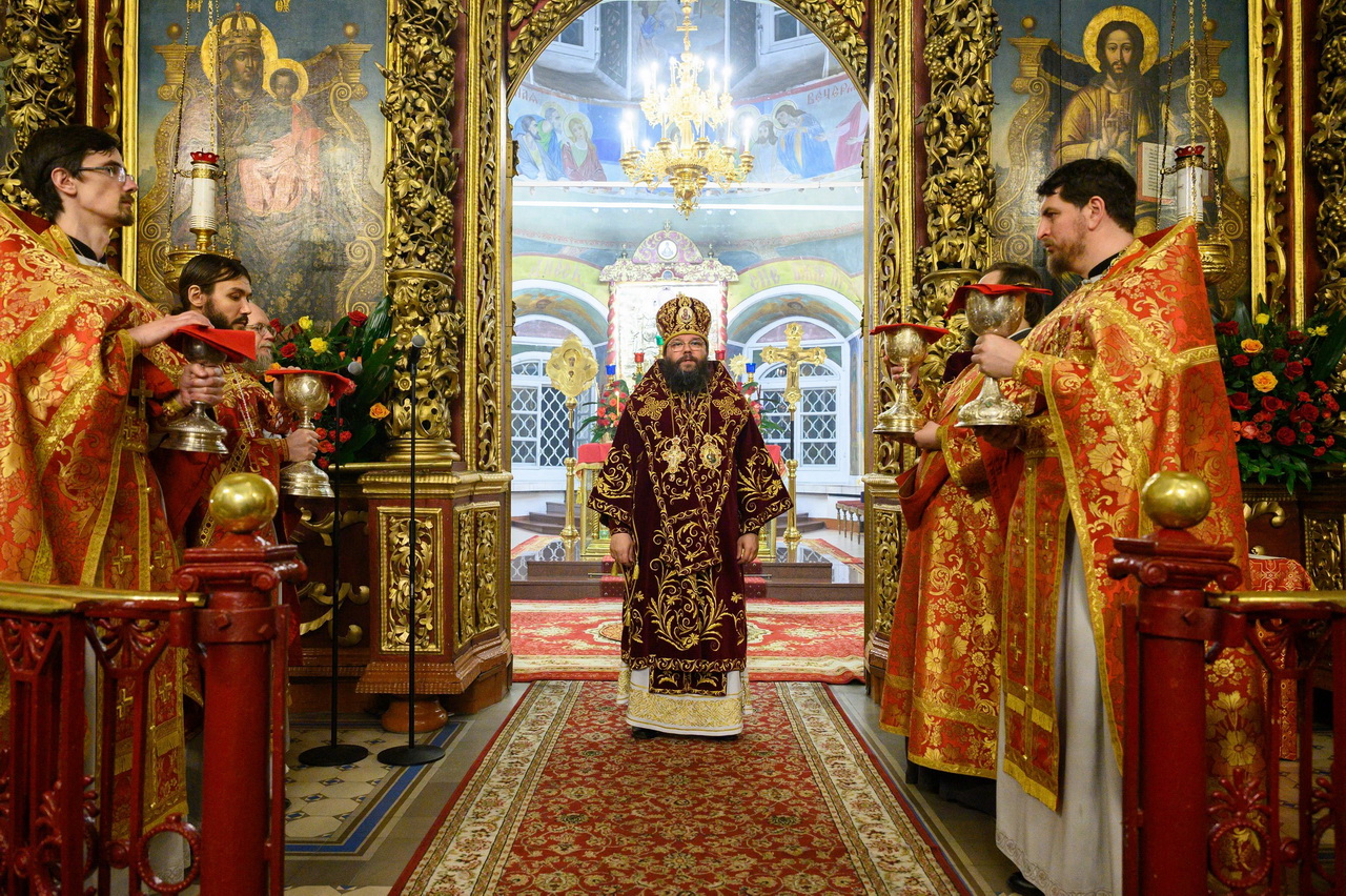 Его Высокопреосвященству сослужили: клирик кафедрального собора протоиерей Артемий Лутченко с соборным духовенством, насельники Свято-Успенского Псково-Печерского монастыря игумен Августин (Заярный) и иеромонах Иоанн (Князев). Богослужебные песнопения исполнил Архиерейский хор под управлением Марии Быковой.