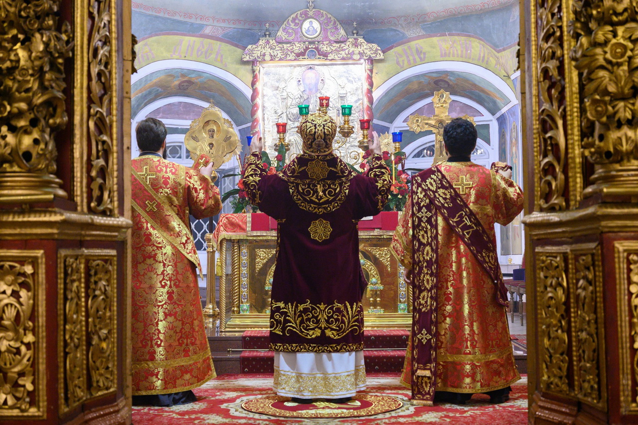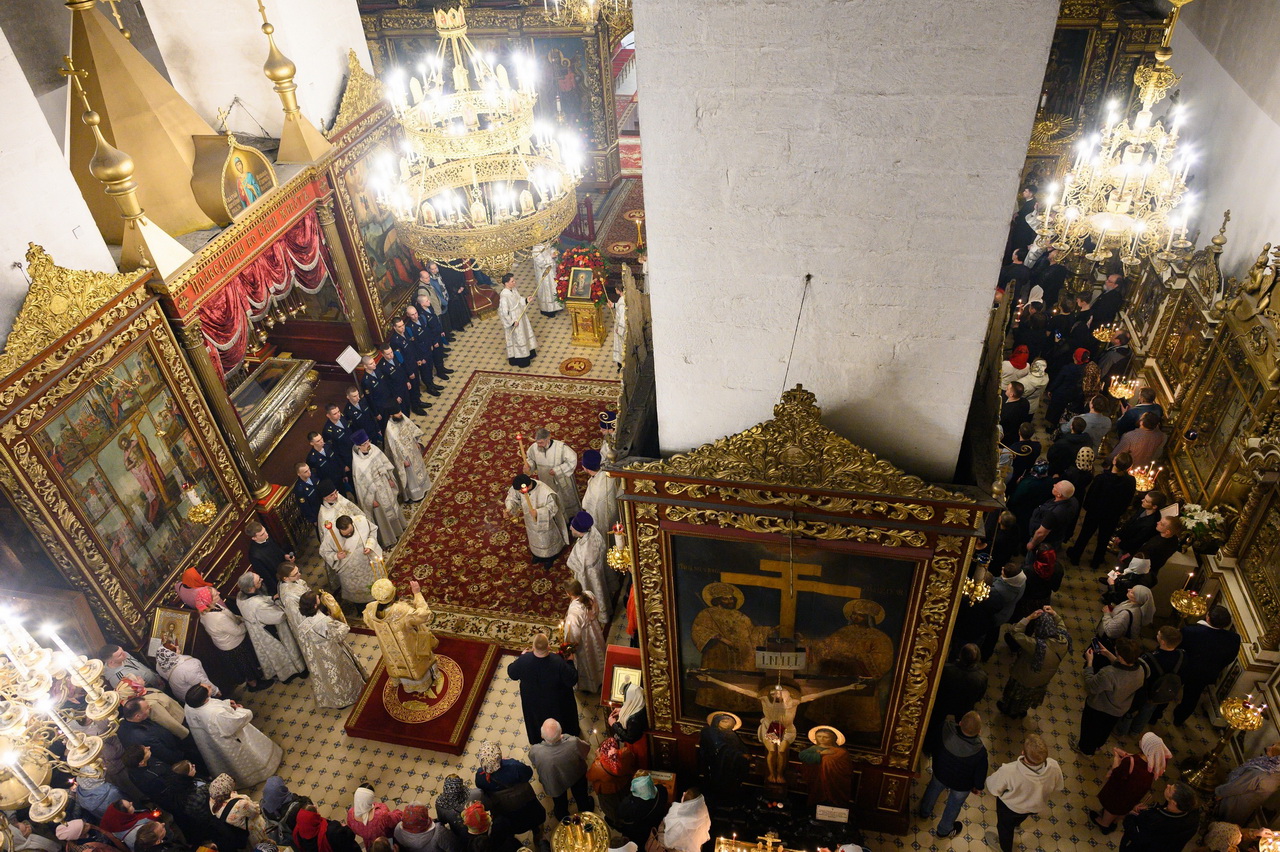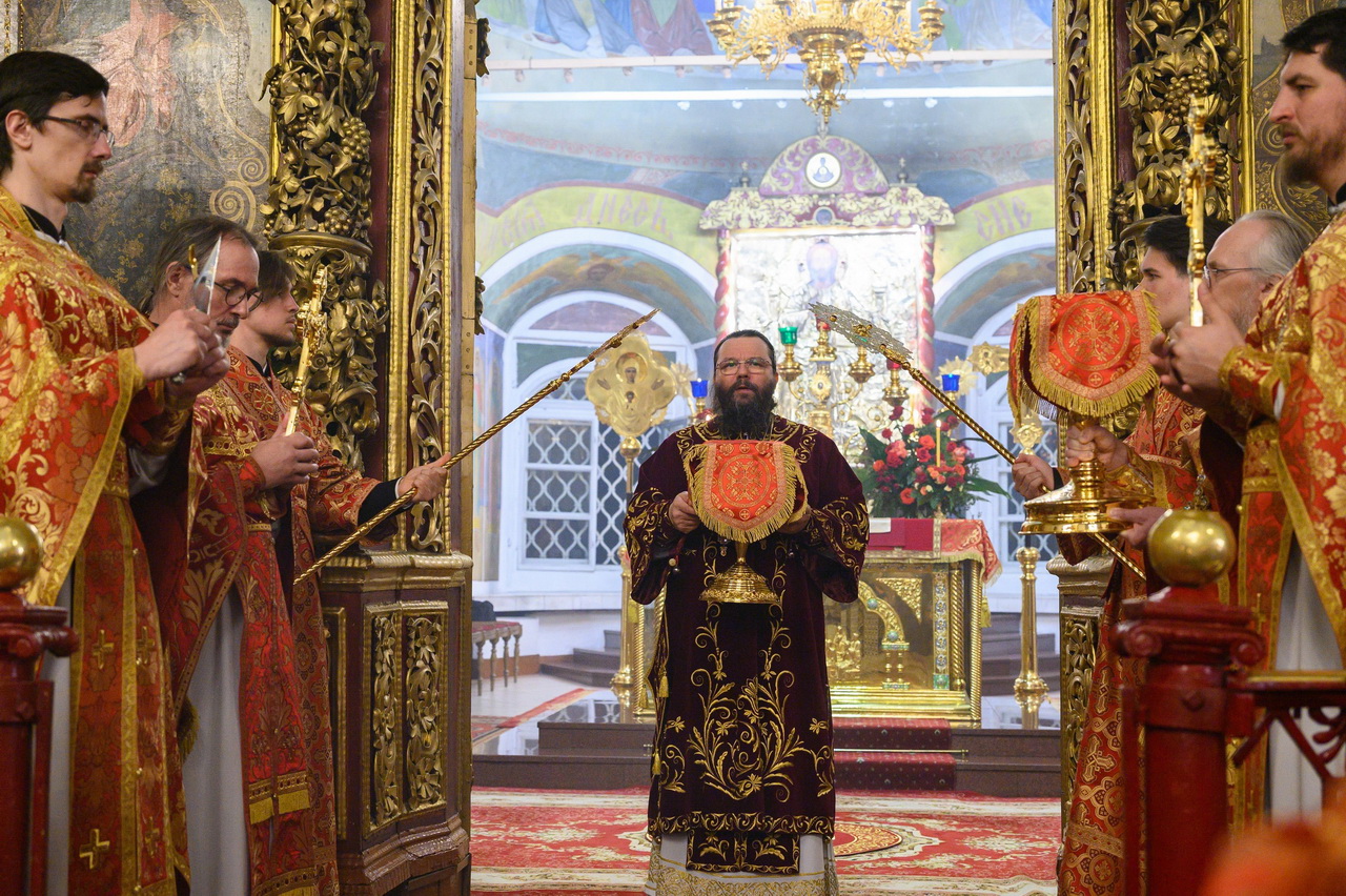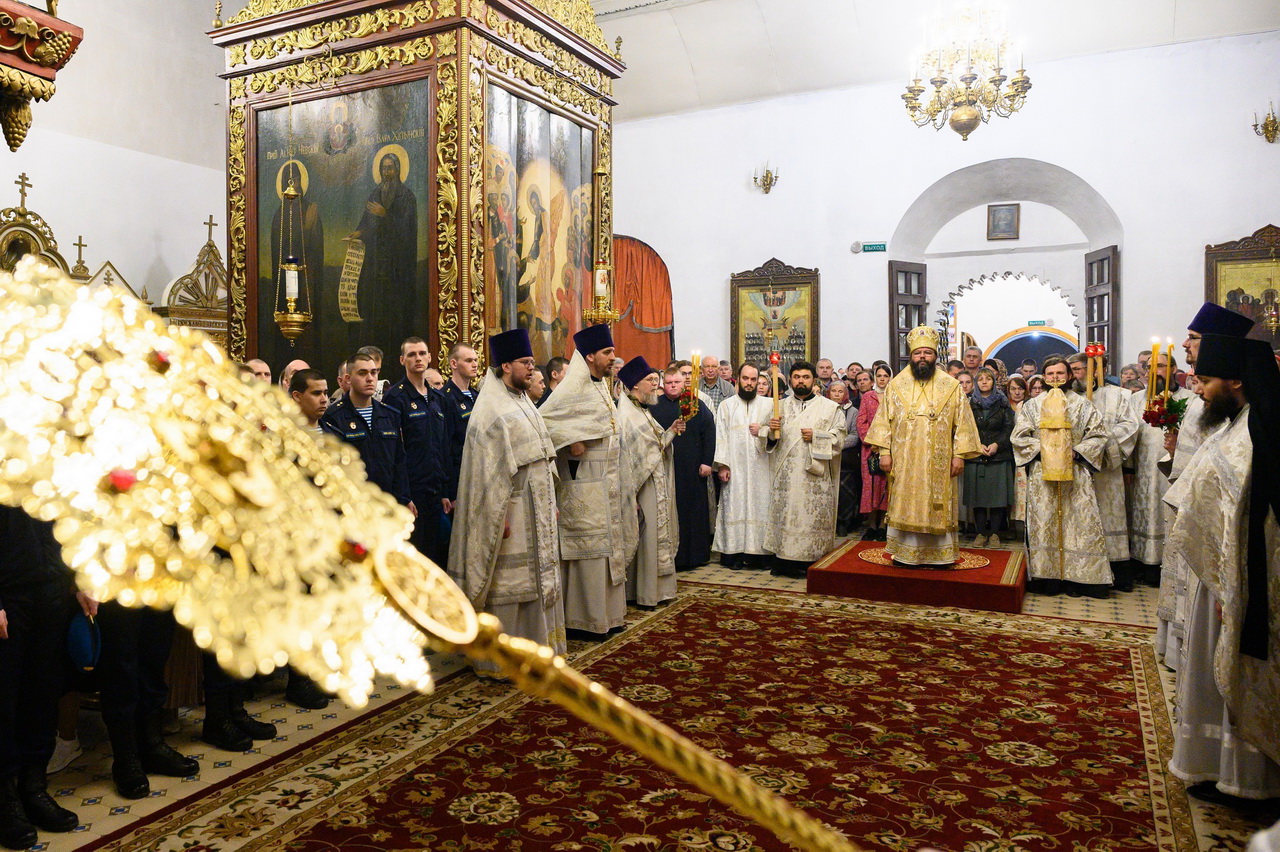 Его Высокопреосвященству сослужили: клирик кафедрального собора протоиерей Артемий Лутченко с соборным духовенством, насельники Свято-Успенского Псково-Печерского монастыря игумен Августин (Заярный) и иеромонах Иоанн (Князев). Богослужебные песнопения исполнил Архиерейский хор под управлением Марии Быковой.