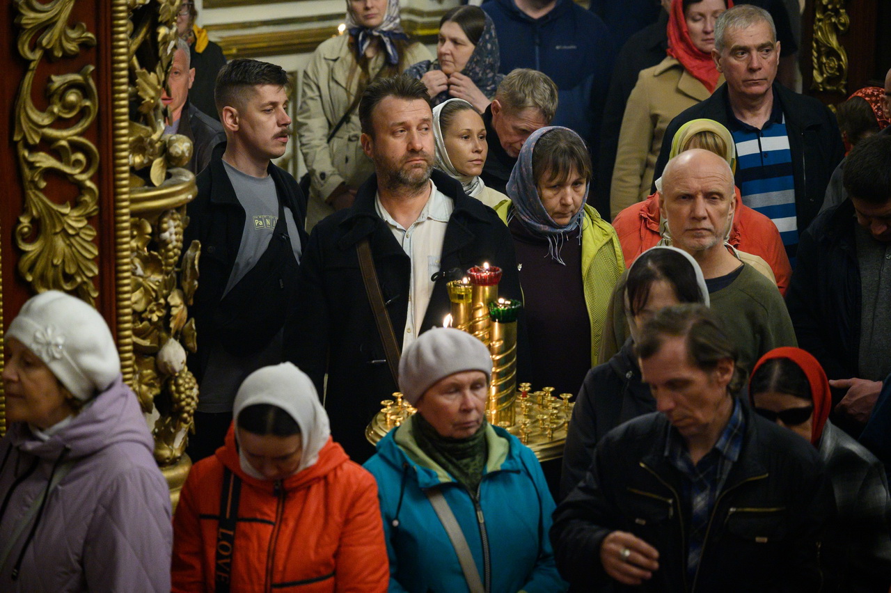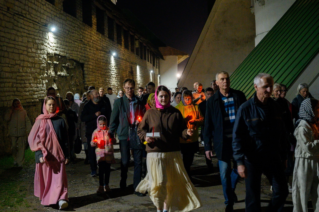 За торжественным богослужением в Пасхальную ночь в кафедральном соборе молились многочисленные прихожане, православные псковичи и паломники.